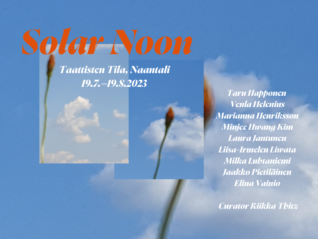Solar Noon is a group exhibition that settles over the landscape of Taattisten tila, entwining the human amidst Earth's interwoven rhythms: its durations and repetitions, the unfathomably large and extremely brief moments. These dazzlingly distinct proportions of a summer’s day affect and are felt in the body. The exhibition aims to play with the orientation of the human within the world’s time; flowing from the past that came long before us and flowering against the future that unfolds without us.
